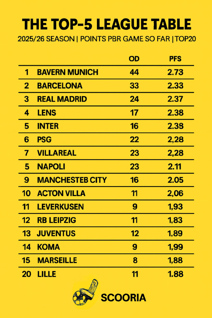 While the Champions League format is evolving and domestic standards varying, comparing Europe’s elite isn’t easy. To level the field, Scooria presents a weekly ranking of the top 20 clubs across the Premier League, LaLiga, Serie A, Bundesliga, and Ligue 1 — based on points‑per‑game (PPG).